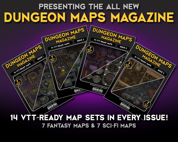 - Dungeon Maps MagazineThe first new title from Paths to Adventure for 2026 is available now! Presenting Dungeon Maps Magazine! Each issue contains a full 14 virtual tabletop (VTT) ready map packs featuring cartography from map master, Justin Andrew Mason. 7 maps with a fantasy theme and another…
